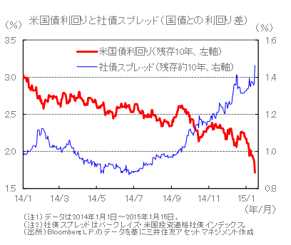 ■12月中旬以降、1月中旬にかけて米国債利回りは低下しました。原油安が急ピッチで進み、投資家のリスク回避的な動きが強まったことから、国債などの安全資産が買い進まれ、10年物米国国債の利回りは、心理的な節目とされる2%を下回りました。12月のISM景況感指数や雇用統計などは米国経済の堅調さを示しました。しかし、同月の小売売上高は前月比▲0.9%下落したことなどから、投資家のリスク回避的な動きが続いています。ギリシャで総選挙が予定され、債務の減免要求を掲げる政党が優勢と見られることやスイスの中央銀行の突然の政策変更も投資家心理を冷やしています。
