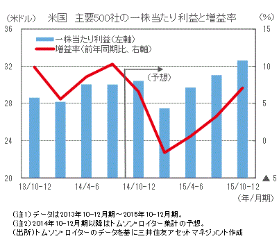 ■今後の増益率の推移をみると、2015年1-3月期は、前年同期比▲50%超の減益が見込まれている「エネルギー」セクターの影響により、全体でも減益の見通しです。その後、増益率は年後半にむけて上昇し2015年通年では前年比+2.7%の予想です。原油安やドル高のマイナス要因は先行して織り込まれ、今後はそのプラスの面が徐々に増益率を押し上げていくと見られます。