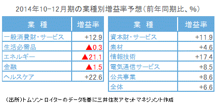 ■11日付のトムソン・ロイターのレポートによると、主要500社(決算発表済み345社の実績とそれ以外の予想を含む)の2014年10-12月期の増益率は前年同期比+6.6%と、決算発表が本格化する直前の予想同+4.2%から上振れています。