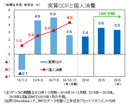 ■2014年10-12月期の実質GDP成長率は、前期比年率+2.6%と市場予想の同+3.0%を下回り、7-9月期の同+5.0%から減速しました。設備投資が大きく鈍化し、輸入が増えたことが成長率鈍化の要因です。
