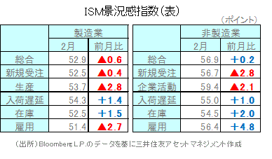 ■2月のISM非製造業景況感指数は、総合指数が前月の56.7から上昇し、56.9ポイントと市場予想の56.5ポイント(ブルームバーグ集計)を上回る結果となりました。