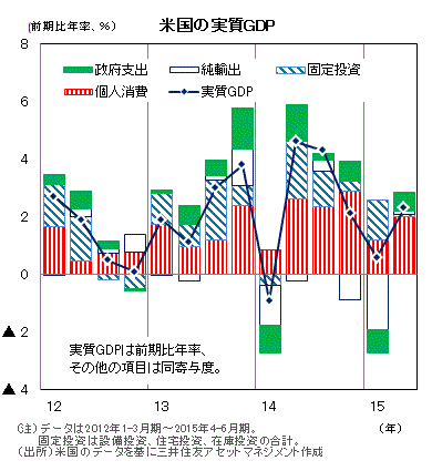 ■米商務省が7月30日に発表した2015年4-6月期の実質GDP成長率(速報値)は、前期比年率+2.3%となりました。市場予想の同+2.5%(ブルームバーグ集計)には及ばなかったものの、1-3月期の+0.6%から加速しました。