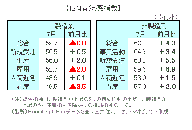 ■7月のISM非製造業景況感指数は、総合指数が60.3ポイントとなり、前月の56.0ポイントから4.3ポイント上昇しました。