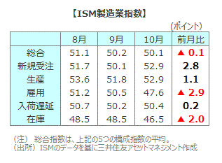 ■10月のISM製造業景況感指数は、総合指数が50.1ポイントとなりました。前月の50.2ポイントから低下しましたが、好不況の分岐点となる50ポイントの水準は維持しました。