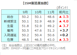 ■11月のISM製造業景況感指数は、総合指数が48.6ポイントとなりました。前月の50.1ポイントから低下し、好不況の分岐点となる50ポイントを割り込みました。総合指数の50ポイント割れは、2012年11月以来3年振りのことです。