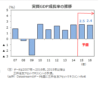 ■2015年の米国経済は、悪天候や港湾スト、中国の人民元切り下げを契機とする世界的な金融市場の混乱などにより鈍化する局面もありましたが、年間では+2.5%程度の成長となる見込みです。