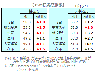 ■ISM景況感指数および、その構成指数は、今年1月~3月を境に米国の景気が拡大のペースを再加速させつつあることを示唆しています。雇用も順調に増加しているもようです。