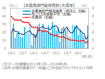 ■2016年6月の非農業部門雇用者数は前月比28.7万人増となり、市場予想(ブルームバーグ集計)の同18.0万人増を大幅に上回りました。