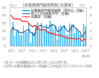 ■2016年7月の非農業部門雇用者数は前月比25.5万人増となり、市場予想(ブルームバーグ集計)の同18.0万人増を上回りました。