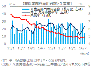■2016年8月の非農業部門雇用者数は前月比15.1万人増となり、市場予想(ブルームバーグ集計)の同18.0万人増を下回りました。