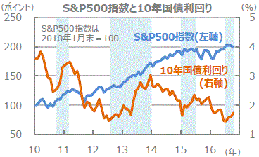 ■米国株式市場は史上最高値圏で推移しています。一方、10年国債利回りは7月8日の1.36%を底に緩やかに上昇しています。10月13日のS&P500指数は2,132.55ポイント、10年国債利回りは1.74%でした。