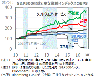 ■トムソンロイター(10月12日)によれば、S&P500の前年同期比増益率は▲0.8%の見通しです。「不動産」が同+1.3%、「金融」が同+0.9%と増益に転じる見通しです。「エネルギー」は同▲70.3%と大幅減益ですが前期よりも改善し、10-12月期には+0.6%の増益に転じる見通しです。「情報技術」は同+4.6%と4-6月期(同+1.7%)よりも伸びが高まる見通しです。