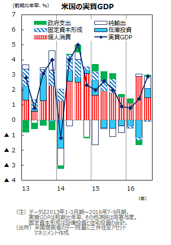 ■米商務省が10月28日に公表した2016年7-9月期の実質GDP成長率(速報値)は、前期比年率+2.9%でした。市場予想の+2.6%を上回り、14年7-9月期の+5.0%以来の高い伸びとなりました。