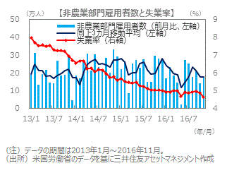 ■2016年11月の非農業部門雇用者数は前月比17.8万人増となり、市場予想(ブルームバーグ集計)の同18.0万人増とほぼ一致しました。