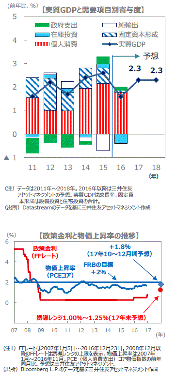 ■続く17年は+2.3%程度の成長が予想されます。経済の軸となる個人消費は、良好な雇用・所得環境に加え、トランプ新政権による個人所得税減税が支えとなり、堅調に推移する見込みです。個人消費等の需要の増大につれ、低迷を続けている企業の設備投資も緩やかに持ち直してくると考えられます。
