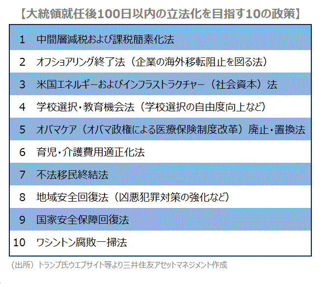 ■トランプ氏は今年10月22日に、大統領就任から100日以内に取り組む18の措置と、議会との協力のもとに立法化を目指す10の政策案を発表しました。