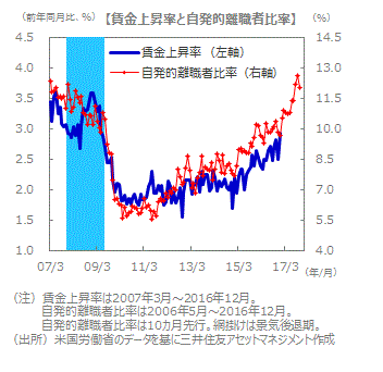 ■他方、賃金は前月比0.4%増、前年同月比2.9%増となりました。上昇基調にある自発的離職者(自らの意思で退職する自己都合退職者)比率が示す通り、労働需給が引き締まってきているため、賃金も緩やかに増加すると予想されます。