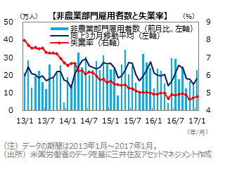 ■2017年1月の非農業部門雇用者数は前月比22.7万人増となり、市場予想(ブルームバーグ集計)の同18.0万人増を上回りました。