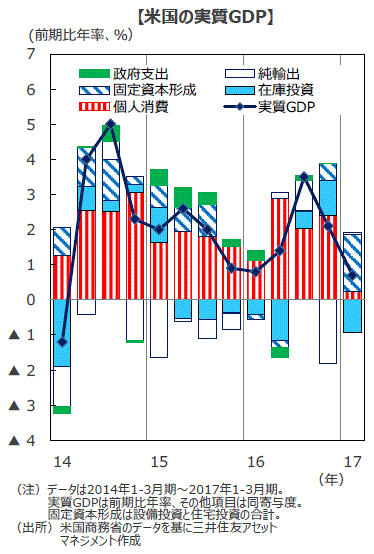 ■米商務省が2017年4月28日に公表した2017年1-3月期の実質GDP成長率(速報値)は、前期比年率+0.7%となり、市場予想の同+1.0%、前期の同+2.1%を下回りました。個人消費の減速と在庫投資の減少が成長率減速の主因です。