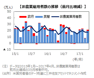 ■2017年4月の非農業部門雇用者数は前月比21.1万人の増加となり、市場予想(ブルームバーグ集計)の同19.0万人増を上回りました。