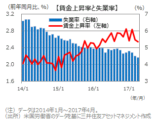 ■米国の景気、雇用は拡大基調を維持していますが、賃金上昇率は緩やかであり、物価の上昇は緩慢なものにとどまると見られます。これらを踏まえると、今後の利上げペースも緩やかなものになると予想され、年内は6月と12月の2回程度になる見込みです。今後、債券利回りは緩やかに水準を切り上げ、株価は景気・企業収益の拡大を織り込む展開になると考えられます。