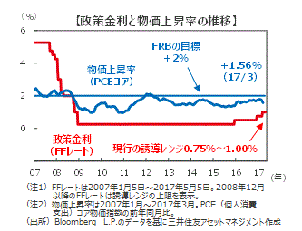 ■その後の年内の利上げは12月と考えられます。米国経済は、循環的に徐々にピークアウトすると見られ、年後半に入れば、現在より減速感が浮上すると思われます。その際に、政治的な不透明感が重なれば、FRBとして1回ぐらい(9月)利上げをスキップすることもありそうです。その後は景気対策の発動なども期待されることから、利上げ再開は12月と考えられます。注目のバランスシートの縮小(保有証券の再投資政策の停止)は、18年3月から開始される見通しです。