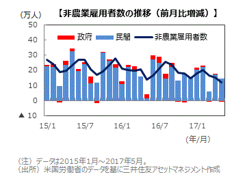 ■2017年5月の非農業部門雇用者数は前月比13.8万人増となり、市場予想(ブルームバーグ集計)の同18.2万人増を下回りました。