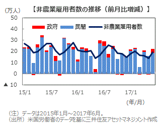 ■2017年6月の非農業部門雇用者数は前月比22.2万人増でした。前月の同15.2万人増から加速し、ブルームバーグ集計による市場予想の同17.8万人増を上回りました。