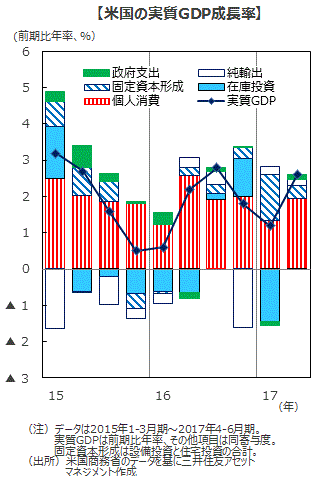 ■米商務省が2017年7月28日に公表した4-6月期の実質GDP成長率(速報値)は、前期比年率+2.6%となりました。前期の同+1.2%を上回り、