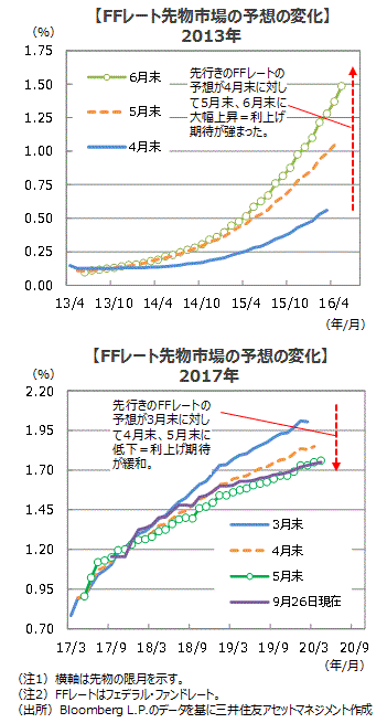 ■その要因の1つとして、量的緩和の縮小が政策金利の引き上げ期待に繋がっていないことが挙げられます。量的緩和の前回の節目は2013年で、当時は市場が混乱しました。その時は、5月22日にバーナンキ議長(当時)が、数カ月以内に債券購入額を減額する可能性に言及したことで、市場では「政策金利も間もなく引き上げられる」との見方が急速に強まりました。