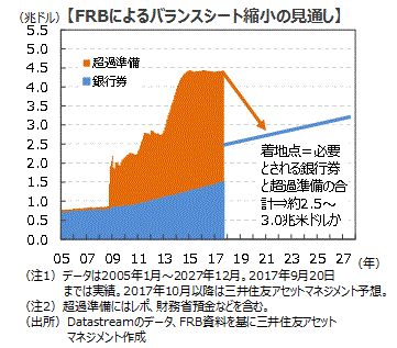 ■短期金利が低位に止まる可能性が高いことに加え、金融市場に存在する資金量が高水準を続ける公算も大きいと考えられます。FRBの資産規模は、現状では約4.5兆ドルに膨らんでいます。FRBはこれを最終的にどこまで縮小させるかは正式には決定していませんが、3-4年かけて約3兆ドル前後に戻す方針と見られます。これは、危機後に増やした約3.6兆ドルのうち、4割程度を吸収するに止めるということを意味しており、流動性は潤沢な状況が続くと考えられます。