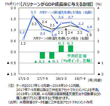 ■米国経済は今後も年率2%前後の成長が続きそうです。ハリケーンの影響でGDP成長率に悪影響が出そうですが、2018年にはそれを取り戻すと予想されます。