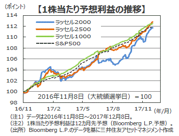 ■米国株式市場を支えている企業業績は依然として好調です。11月上旬には、小型株の業績見通しが一時下振れました。これは米税制改革法案に対する期待の低下などが要因でした。その後、米税制改革法案は11月16日に下院本会議を通過し、12月2日には上院本会議を通過したことで、法案成立の可能性が高まり、小型株の予想利益も上方修正されました。