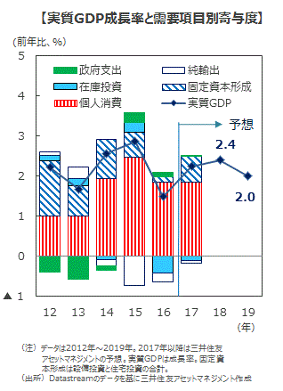 ■18年は同+2.4%程度の成長が見込まれます。生産の拡大が、雇用、所得の増加を通じて消費を押し上げ、それが生産のさらなる拡大を促すという好循環が想定されるためです。加えて、トランプ政権の税制改革(減税)の効果も期待できます。