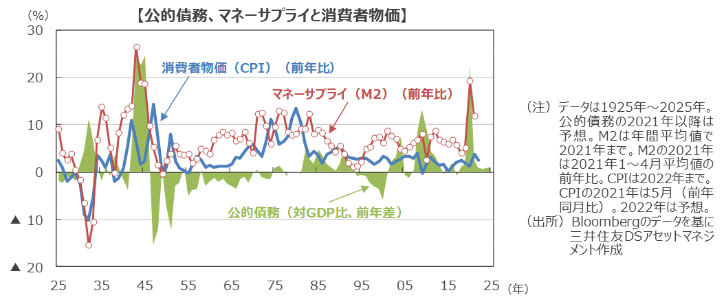 ■1つ目がマネーサプライ(M2)の増加、2つ目が公的債務の拡大、です。実際、1925年以降の消費者物価指数(CPI)の前年比を見ると、公的債務が拡大したり、マネーサプライの伸びが高い局面で、CPIが大きく上昇しています。
