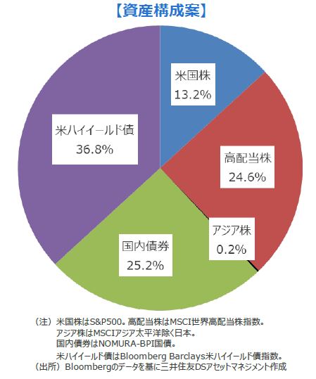 ■一方、相対的にリスクが低く株式との分散効果が働きやすい国内債券を25%組み入れています。外国債券では国債よりも利回りの魅力的なハイイールド債券を組み入れています。