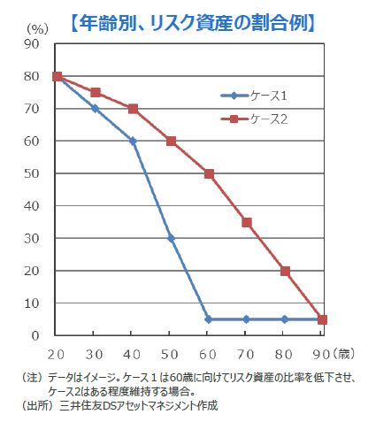 ■資産運用においては、株式をはじめとしたポートフォリオのリスク資産の配分を、ライフプランに合わせて徐々に低減させていくのが一般的です。人生100年時代において長生きに備えるためには、退職の日を迎えてもリスク資産の比率を急激に下げるのではなく、ある程度維持しながらリターンを享受すべきといえます。