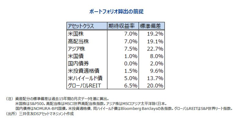 ■右のポートフォリオは、年間の投資からのリターン見込みを+4.5%として最適化を行ったものです。4.5%のリターンが上がれば、多少インフレ率が上昇してもそれを上回って資産を増やすことができます。リスク許容度がより高い家計は、株などリスクの高い資産の組み入れ比率を高めにすることになります。
