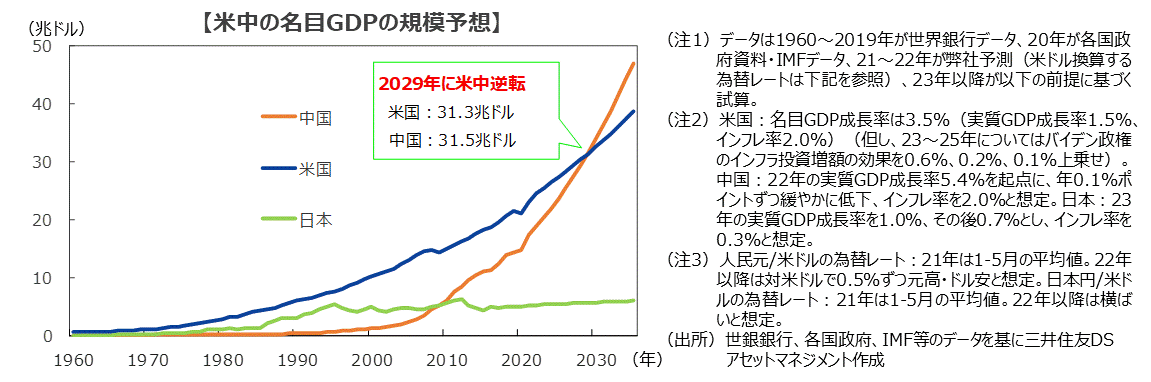 ■ところが、そういった安定的な状況が変わりつつあります。それが米中対立です。トランプ前米大統領時代には「貿易戦争」が話題になりましたが、中国の目覚ましい経済発展により両国の経済規模は接近してきています。同時に、中国の技術進歩は圧倒的と言われた米国の軍事的な優位性を揺るがす状況となってきています。両国の争いは、最先端ハイテク・軍事技術、環境対応、人権、領海など、あらゆる分野に及び、今後、米中を論ずる際に「戦争」というキーワードは日常的に使われることになると見られます。