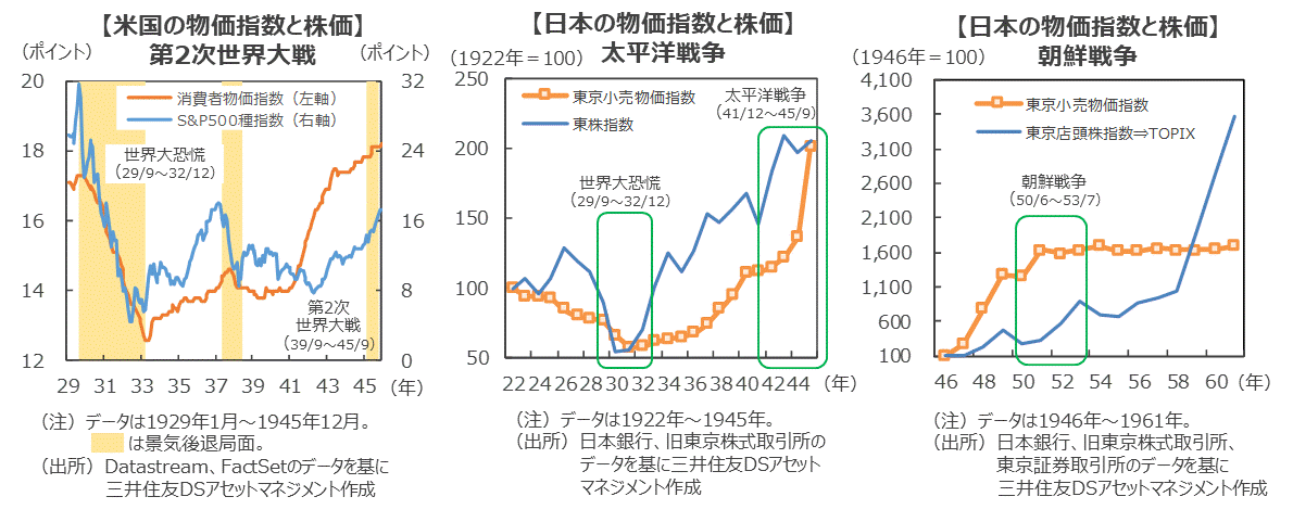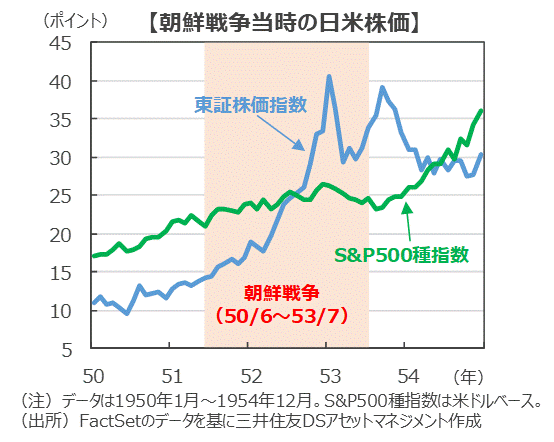 ■とは言え、「戦争」によって強烈な超過需要が発生するので、戦場とならない限り、供給基地となり得る近隣の国への株式投資はメリットがありそうです。例えば、1950年6月に勃発した朝鮮戦争で、東証株価指数は1950年6月から1953年7月までで3.5倍となり、米国S&P500種指数(同1.4倍)を大きくアウトパフォームしました。近くの「戦争」でも戦場にならない限りは「慌てない」、といったスタンスでしょうか。