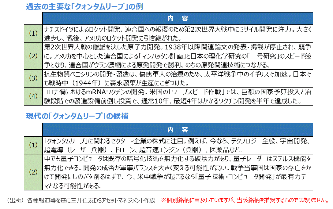 ■「戦火を凌ぐ」ポートフォリオを構築するのであれば、世界の最先端技術をリードする産業やセクター、企業の株式をポートフォリオに組み入れることが有望な選択肢になる可能性があります。現代版「クォンタムリープ」に乗る、ということが重要ではないでしょうか。