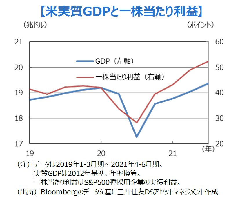 ■以上のことを考えると、感染拡大に対する株式市場の耐性は強いと言えます。よく言われる、「実体経済は回復していないのに株だけが上がっている」という現象が生じるのはこうした理由からです。米国の実質GDPはコロナ前の水準をようやく回復した程度ですが、上場企業の一株当たり利益はコロナ前の水準を大きく上回っており、株式市場の上昇はファンダメンタルズの改善を伴っていると言えます。このように、感染再拡大のような状況では、これまで以上に実体経済と株式市場をはっきりと分けて考える必要があります。