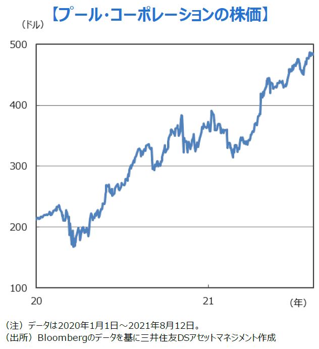 プール・コーポレーションは、プール用品・機器および関連レジャー製品の世界最大の卸売業者です。北米、欧州、豪州などでプール建設業者やリフォーム業者などにサービスを提供しています。ステイホーム需要や郊外への移住ブームの恩恵を受け、2020年の売上高は2019年の32億ドルに比べて23%増の39億ドルとなり、純利益は前年の2.6億ドルに対し40%増の3.7億ドルとなりました。