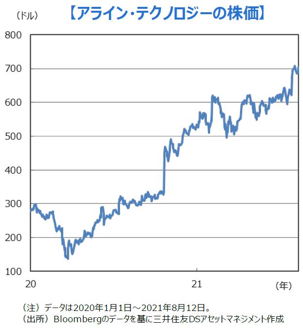 アライン・テクノロジー社は、インビザラインという歯列矯正用マウスピースを製造する医療機器メーカーです。歯科用口腔内スキャナー、歯科技工所や歯科医師向けのコンピューター、ソフトウェアの製造・設計・販売も行っています。ロックダウンによって歯列矯正は不要不急と考えられ、株価は2020年1月から3月にかけて50%を超える下落となりました。しかし、その後はマスク生活の継続により歯列矯正への需要が高まり、2020年の売上高は前年の24億ドルに比べて3%増の25億ドル、純利益は前年の4億ドルから18億ドルに増加しました。株価は2020年3月の底からおよそ6倍となりました。