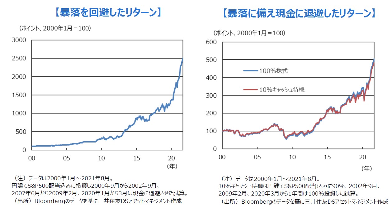 ■例えば、暴落の前に株式投資を現金に換え、相場の底値で株式に戻すと言った、暴落を回避することを考えてみます。前述の通り、2000年以降、暴落局面は3回ありましたが、2000年9月から2002年9月、2007年6月から2009年2月、2020年1月から3月に株式から現金へと資産を移し(月の末日基準)、底値で株式に戻すことができていれば、2000年1月以降の累積リターンは+2402%となります。一方、同期間、米国株式をずっと保有していた場合のリターンは+404%です。