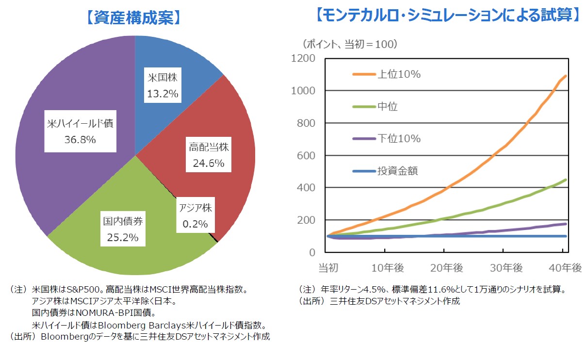 ■一方、年齢面やライフプラン上、投資期間を長くとることができなかったり、一時的にせよ損失の発生を極力抑えたりしたいときは、リスクを抑えた運用が必要となります。例えば、7月6日のレポート『長生きに備えるポートフォリオ戦略』で提示したリターン4.5%、標準偏差11.6%のポートフォリオなどが候補となります。