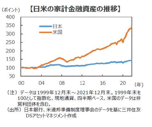 ■1999年末からの約22年間に、日本の個人金融資産は1,400兆円から2,000兆円へと約1.4倍に増加しました。この間、米国の家計金融資産(非営利団体を含む)は34.5兆ドルから118.2兆ドル(1京3,600兆円)へ、約3.4倍に増加しました。1999年当時の米国の家計金融資産は日本の約2.5倍と、人口比(2.2倍)に近い水準でしたが、現在その差は6倍を超えるまでに広がっています。