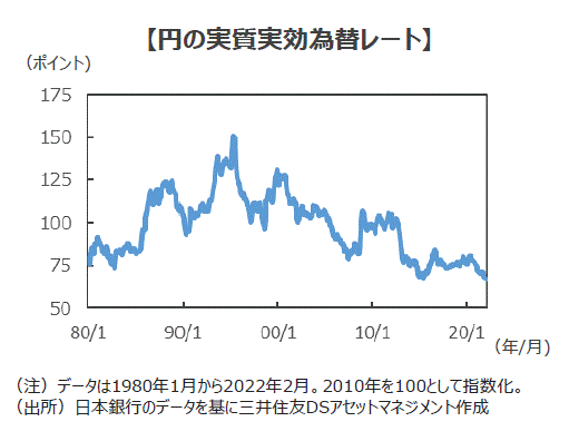 ■例えば、10年前に退職金2,000万円を全額銀行預金とし、その後10年間まったく手をつけなかったとします。預金通帳の残高は2,000万円で変わりはありませんが、海外の人たちから見たこの預金の価値は、10年前に比べて640万円以上減少している計算になります(2012年4月から2022年4月までの実質実効為替レートの低下幅▲32.25%)。