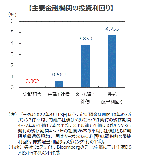 ■例えば、大手邦銀が発行する円建て社債の利回りは、平均で0.589%(メガバンク3行、残存期間4~7年)、米ドル建てなら同3.853%になります。また、こうした金融機関の発行する株式を買うと、その配当金利回りは平均で4.755%にもなります。