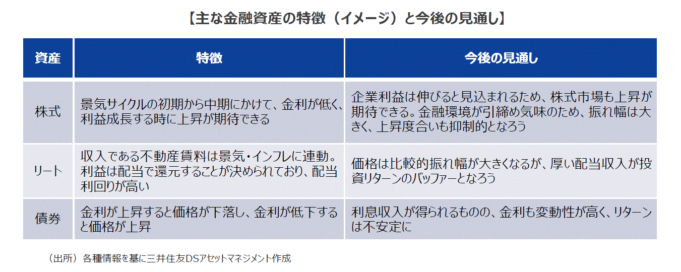 ■以下に主要資産の特徴と今後の見通しをまとめました。当面の間は、価格上昇よりも安定的なインカム収入に着目した投資に分がありそうです。この点では、配当利回りが高いリートが投資対象として浮かび上がります。
